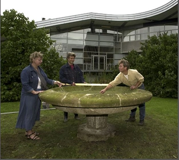 Toen Huize Ocrum werd verbouwd voor de vestiging van Nieuwe Veste en bibliotheek, moest de fontein mee naar de nieuwe locatie van St. Joost. In de loop der jaren werd de fontein namelijk gezien als het beeldmerk van de academie. Bij de hijswerkzaamheden werd er echter geen rekening gehouden met het feit dat de fontein in het midden verankerd was, en de randen van broze steen en de schaal van de fontein werd ernstig beschadigd.