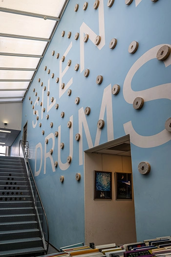 Quote van de kunstenaar over deze muur: “Een streepjescode is gecodeerde informatie, een bibliotheek: een huis vol gecodeerde informatie.”