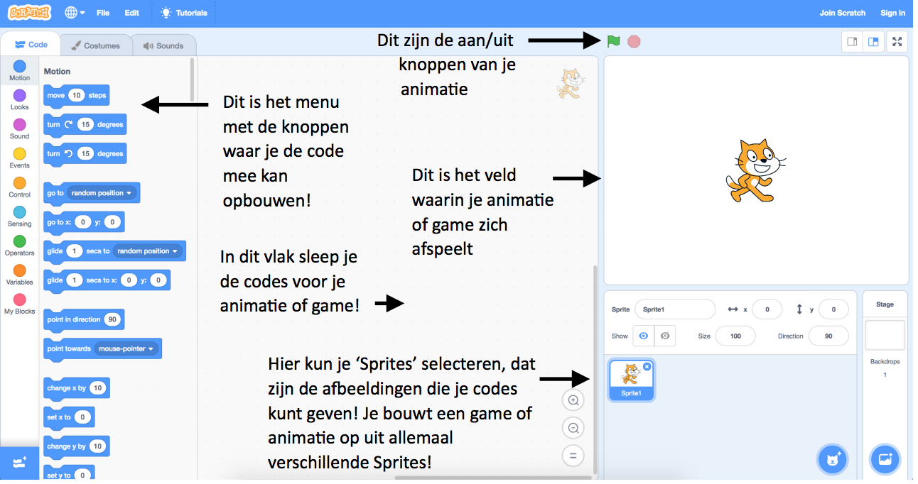 Vandaag gaan we een animatie maken in Scratch! Scratch is een programma waarbij je animaties kan maken, maar ook games en muziekinstrumenten. Het is een handige website om te leren programmeren.